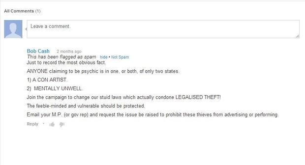 Someone who is not impressed with either Mrs Field or psychics in general is Bob Cash. This may or may not be his real name, but his comment below was posted to a video clip called June Field – Psychic Detective 3/5, which was uploaded by Mrs Field. It was flagged as spam, and has now been blocked from UK viewing. Hmm.