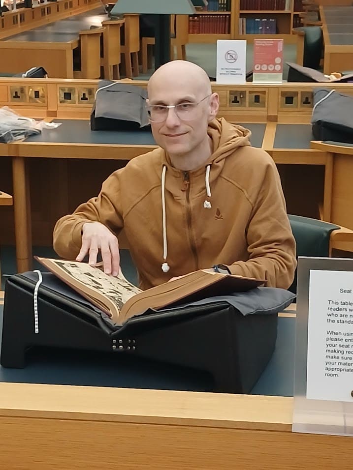 The two photographs below were taken in Rare Books on March 23, 2026, by me. Normally, we meet in the Newsroom but here we were both researching something from comics which are restricted, scanning not allowed, although photographs are.